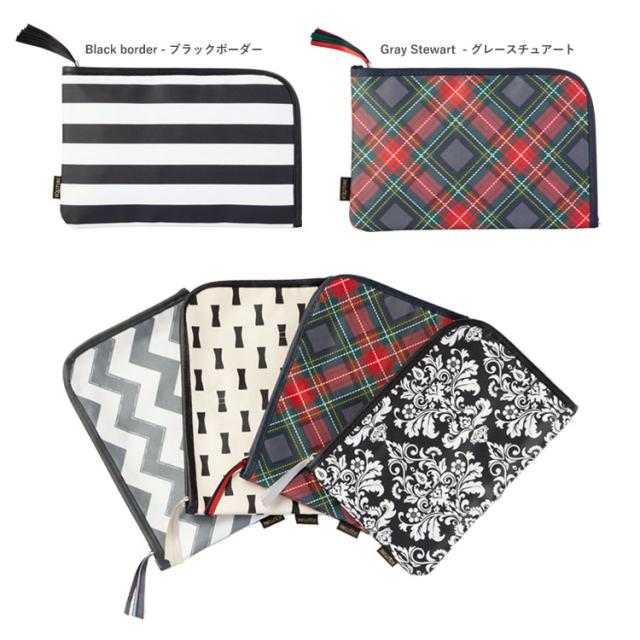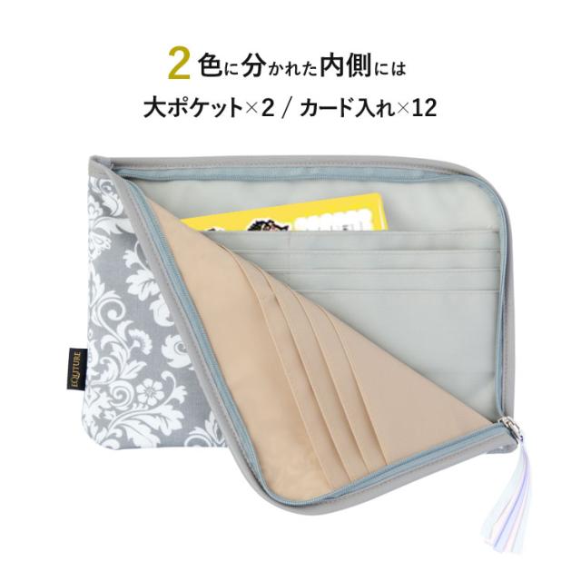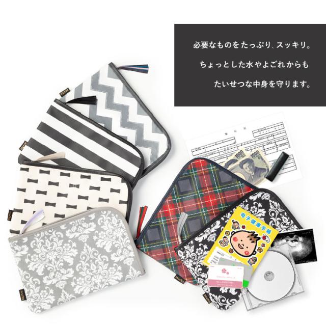 大きくひらくL字ファスナー型の手帳ケースに必要なものをまとめておけば、バッグを替えても安心。