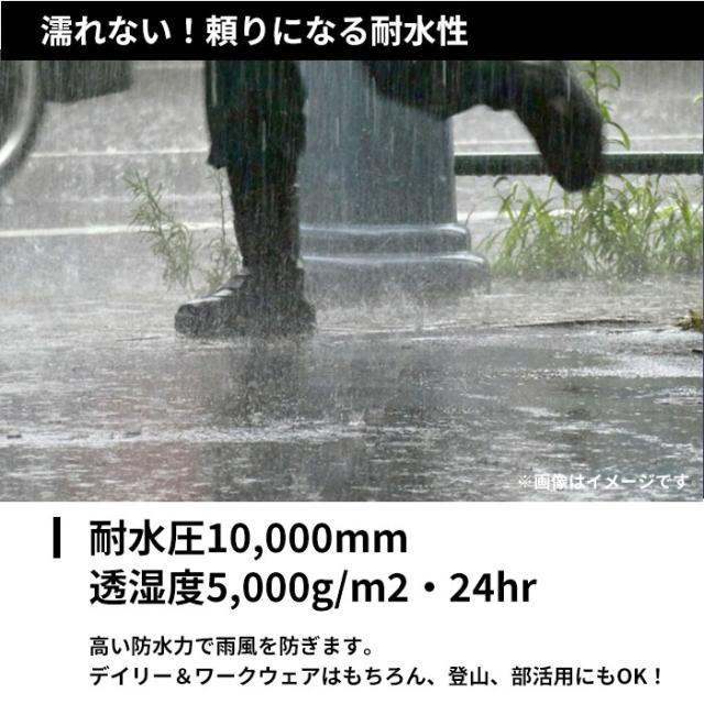 | 素材 | 表:ポリエステル100% 裏:透湿PUラミネート メッシュ:ポリエステル100% |