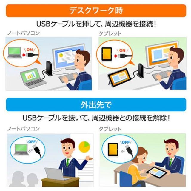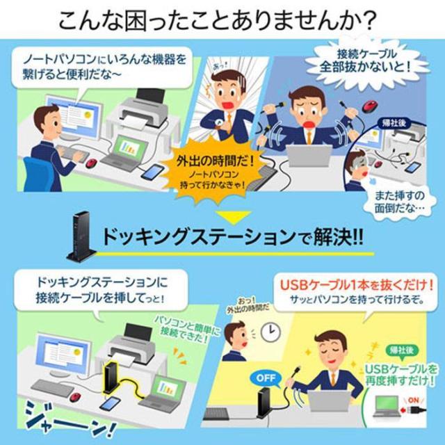 USBケーブル1本でディスプレイ2台出力、有線LAN接続、USBオーディオ接続、各種USBデバイスの拡張接続ができるUSB3.1ドッキングステーションです。USBポートからのディスプレイ増設(HDMI×2)に対応しており、簡単にマルチディスプレイ環境(ミラーモード/拡張モード)を実現できます。最大4K2K/3840×2160(60Hz)解像度での2台同時HDMI出力に対応しており大画面での作業が可能です。タブレットなどを接続し簡易的に立て掛け設置ができるスタンド機能を搭載しています。※厚さ15mm程度までのタブレットを想定しています。簡易的なスタンドのため厚みのあるタブレットやノートパソコンでは安定した設置が難しい場合があります。USB3.1 Gen1対応だから超高速なデータ転送が可能です。アクセスしやすい前面にUSB3.1 Gen1×2ポート、USB3.1 Type-C Gen1×1ポートを搭載しています。背面にはUSB2.0×2ポートを搭載し、キーボードやマウス、様々なUSB2.0機器を接続でき、USBケーブル1本の接続で快適に使用できます。Gigabit Ethernet(1000BASE-T)に対応していますので、Gigabitネットワーク環境にも対応でき、USBケーブル1本で有線LAN接続をすることができます。パソコン用スピーカー・マイクも接続でき、USBスピーカー・USBマイクとして利用することができます。頻繁に持ち運びする小型ノートパソコンやタブレットなどをUSBケーブル1本の接続で様々な機器に接続・出力でき、快適な操作環境を実現します。オフィスなどではスマートに接続し、会議など移動時にはUSBケーブル1本を抜くだけ。会議終了後にはUSBケーブル1本を接続するだけですぐに様々な機器を利用できます。<制限事項>※本製品はパソコン本体のUSBポートに直接接続してください。USB ハブ、増設のUSBポートではご利用いただけません。※本製品はHDCP機能には対応しておりません。※本製品では著作権保護された映像(ブルーレイ映画など)を再生出力することはできません。※DirectX、OpenGL等のAPIは対応しておりません。※クローンモード(ミラーモード)での動画再生は対応しておりません。※本製品の取り外し・接続に関して基本的にプラグアンドプライには対応しておりますが、まれにUSB認識のタイミングエラーにより正常に表示しない/動作しない場合があります。再度抜き差ししお試しください。これは本製品の不具合・故障ではありません。※本製品はWindows OSが動作している状態で使用するものです。システム起動時やBIOS画面では動作しません。(表示しません)※本製品のUSBハブポートにUSBデバイスを接続する際、一瞬画面が消えることがありますがこれは本製品の仕様です。※本製品はUSBポートから映像・LAN信号・オーディオ信号などを変換し出力・入力するものでありパソコンの性能に大きく左右されます。必ず対応機種以上のパソコン環境にてご利用ください。※対応機種、対応接続機器・環境の場合であっても正常に動作しないことがございます。