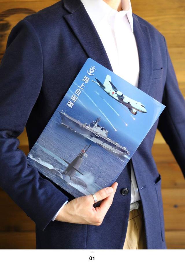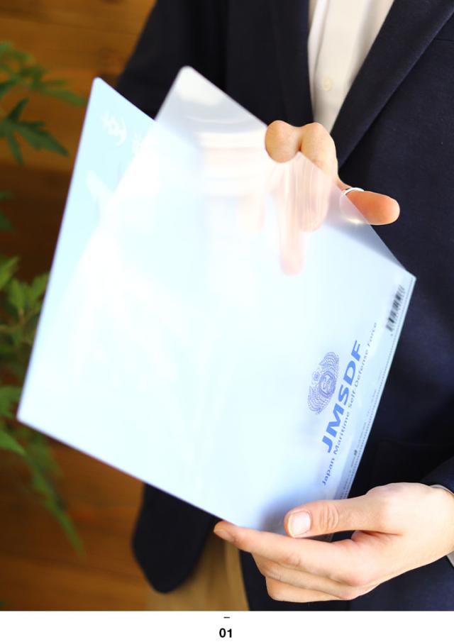 航空機や護衛艦、潜水艦など海上自衛隊各装備のフィルム写真をコラージュしたスペシャル感漂う仕上がり。裏面中央にはシンボルマークのイカリ(錨)や桜の花をモチーフにした正式デザイン入り。クリアー透明)になっており、中の書類が確認できます。