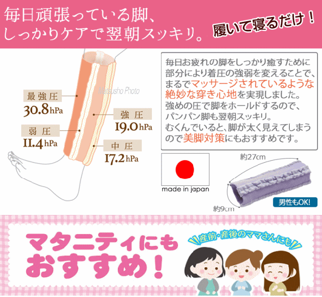 ![]() ![]() ![]() ![]() 毎日履くだけの脚ラク新習慣! ☆毎日履くだけの脚ラク習慣 ☆ムクミが気になる方 ☆足の疲れが気になる方 ☆翌朝スッキリ ■医学博士監修。ゴム糸を一切使わない特殊なベアー編みで作られたふくらはぎ用着圧サポーター。 ■3本の中弱圧ラインとその間にある強圧ラインとが組み合わさった4段階の強弱マッサージライン。 ■血行を刺激して血流の流れをスムーズにしてだるさ・疲労・むくみの解消でスッキリ美脚に。 ■弱編みと強編みの組み合わせが手もみマッサージをされている様なほどよい着圧効果を足に与えます。 ■幅広弱圧ラインがふくらはぎを重点的にマッサージ、こむら返り、足のつりを予防します。 ■着けて寝るだけで一晩中足をマッサージ!疲れが取れて一日を気持ちよくスタートさせられます。 ■血行の促進を促す事で冷え性の対策にも。 | ||||||||||||