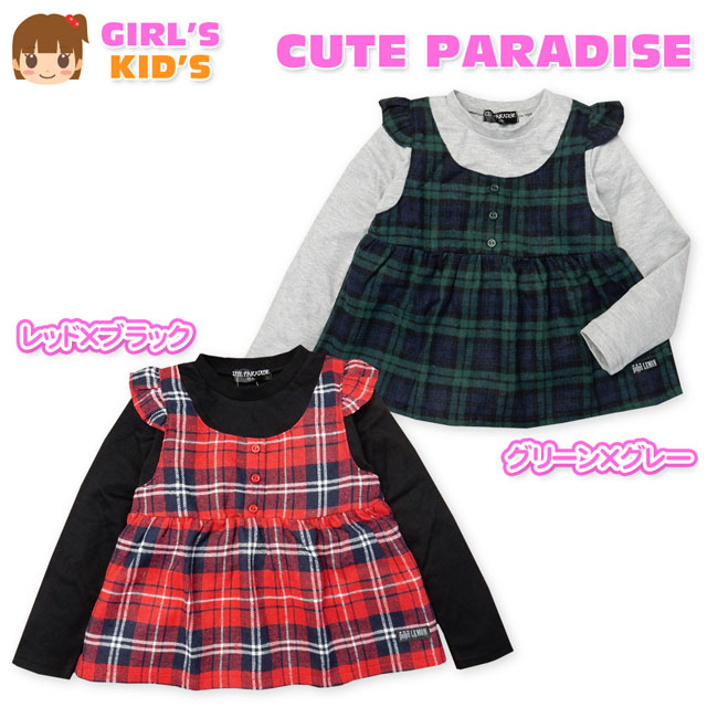 【送料無料】子供服 女の子 Tシャツ 長袖 重ね着風 スムース素材 チェック柄 フリル ワッペン 女児 キッズ 110cm 120cm 130cm【メール便対応】