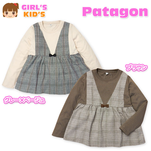 【送料無料】子供服 女の子 Tシャツ 長袖 ジャンスカ重ね着風 グレンチェック柄 スムース素材 女児 キッズ 110cm 120cm 130cm【メール便対応】
