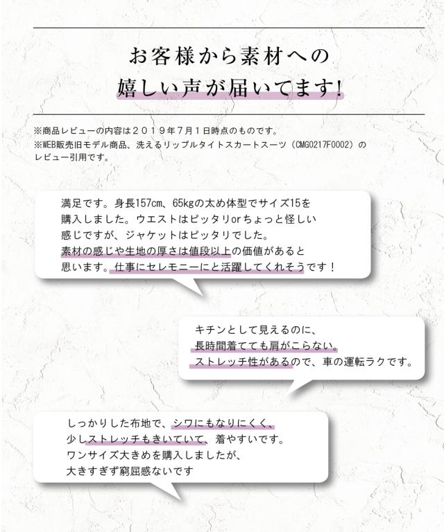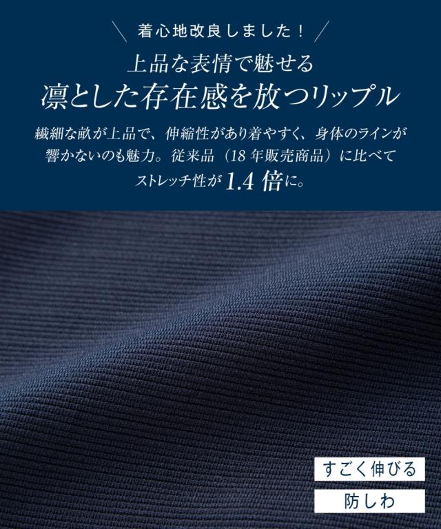 ◆やみつきになる楽々着心地と取り扱いやすさ、ストレスフリーなリップルジャージー・着心地楽ちんなのにキレイに決まる伸縮性抜群のセットアップリップルジャージースーツ、従来品(18年販売商品)に比べてストレッチ性が1.4倍に!・ジャージーなので持ち運んでも座り仕事をしてもしわになりにくく、洗濯機洗いできてアイロンもほぼ要らない等取り扱いがとっても簡単です。・細畝のリップルは上品なきちんと感がある上、伸縮性もあるの着心地は楽ちん、表面感があるので、身体のラインを拾いにくい優れもの。・スッキリとしたノーカラーのジャ