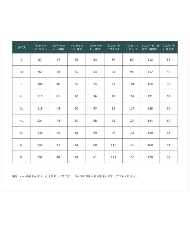 品質=[表地]ポリエステル95%・ポリウレタン5%(カットソー リップル)[裏地]有(総裏:トリコットメッシュ裏地使用) ジャケット:肩パッド有 前ホック開 袖口スリット ポケット前2 スカート:左脇ファスナー ウエスト総ゴム入 <機能>360°ストレッチ素材・防しわ・UVカット・五面体仕様(LL〜)この商品は2点同サイズのみで販売します。中国製洗濯機OK ネット使用