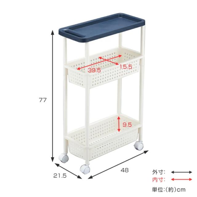 | サイズ | キャスター装着時 外寸:約 幅21.5×奥行48×高さ77(cm) バスケット内寸:約 幅15.5×奥行39.5×高さ9.5(cm) |