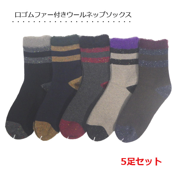 靴下 ファー付き 【5足組】 ウールネップソックス クルー丈ソックス レディース