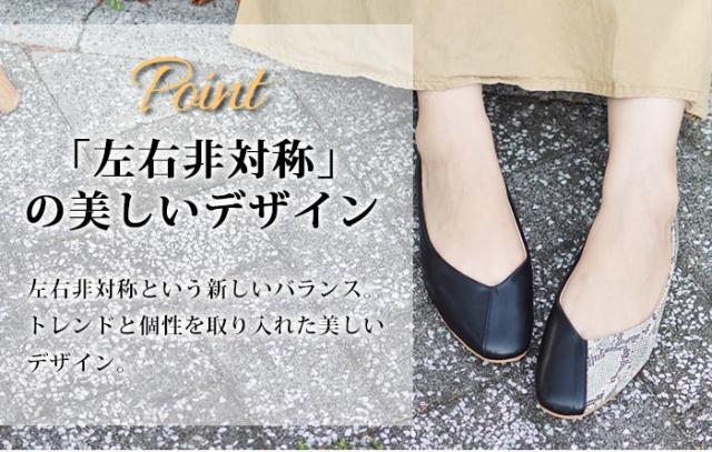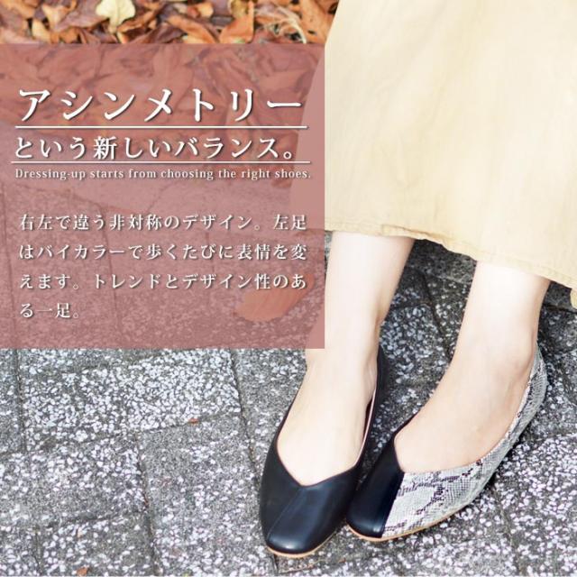 大人キレイなフラットパンプスが入荷!バイカラーになっており、左右でデザインが違うアシンメトリーでお洒落なデザイン。Vカットのアッパーが足のラインを美しく見せてくれます。丸みのあるスクエアトゥで足元を女性らしくしてくれます。使いやすい色味なので色んなコーディーネートと合わせやすい!今年大人気のパイソン柄も取り入れた個性あるデザインです!シーンを選ばないシンプルなデザインなので一足あればとっても便利なオススメのアイテムです。