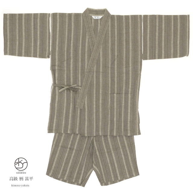 甚平 メンズ おしゃれ 父の日 茶系 ブラウン 縞 ストライブ シンプル 綿麻 しじら織り 手タコ糸仕立て 夏祭り 花火大会 男性用 カジュアル Mサイズ