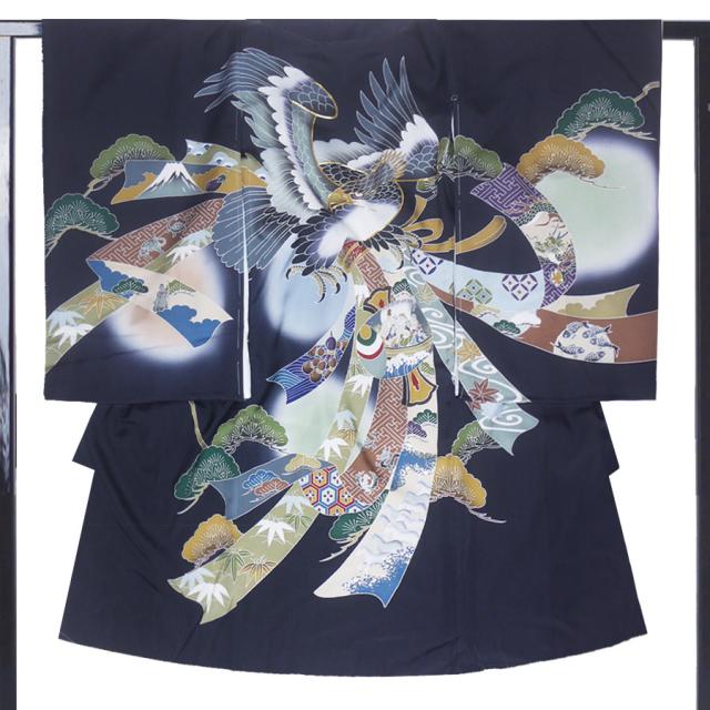 男児 熨斗目 レンタル お宮参り 着物 帽子 よだれかけ セット 男の子 貸衣装 和服 祝い着 初着 産着 往復送料無料 紺 鷹