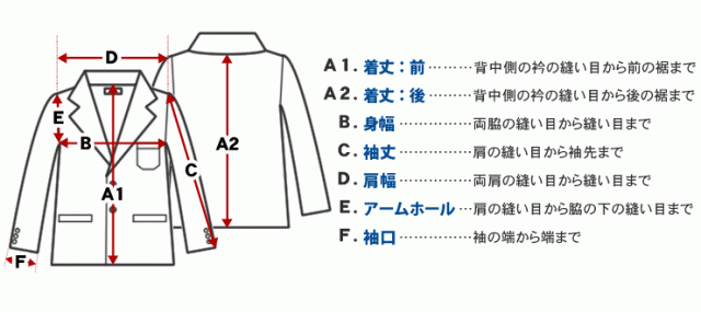 | サイズ | A1 着丈:前 | A2 着丈:後 | B 身幅 | C 袖丈 | D 肩幅 | E アームホール | F 袖口 | |