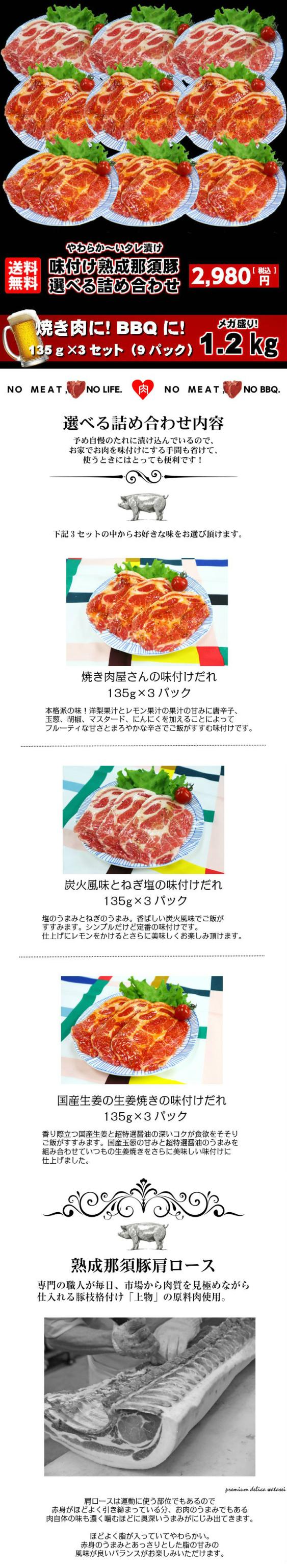 やわらかいタレ漬け味付け熟成国産那須豚選べる詰め合わせ。焼肉にBBQにいかがでしょうか。あらかじめ自慢のタレに漬け込んでいるので、お家でお肉を味付けにする手間も省けて使う時にはとっても便利です。