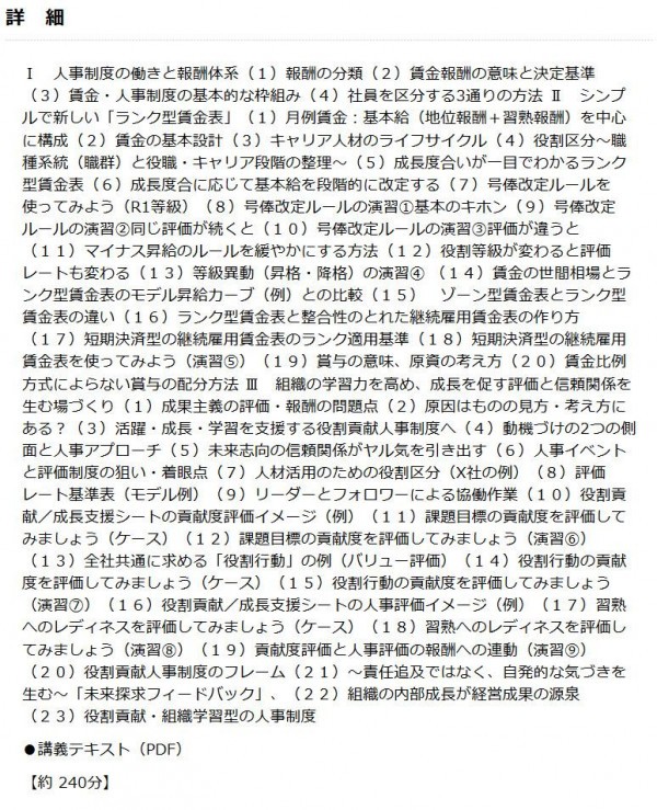 | 本DVDは、4時間にわたる充実した内容で、「一本の通し賃金表」を用いたシンプルな賃金制度の作り方と評価の仕方がわかります。また、賃金制度を実際にものにすることができる演習問題とその解説も収録しています。 |