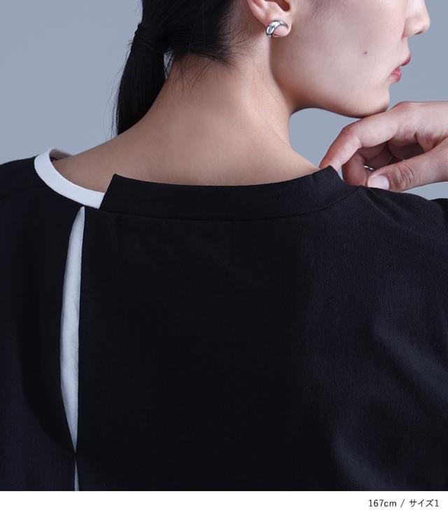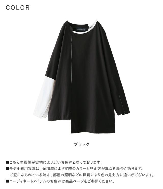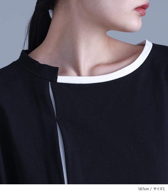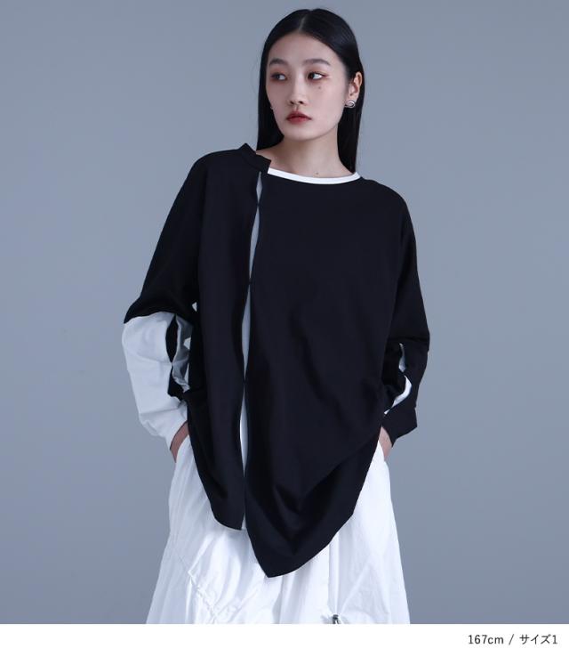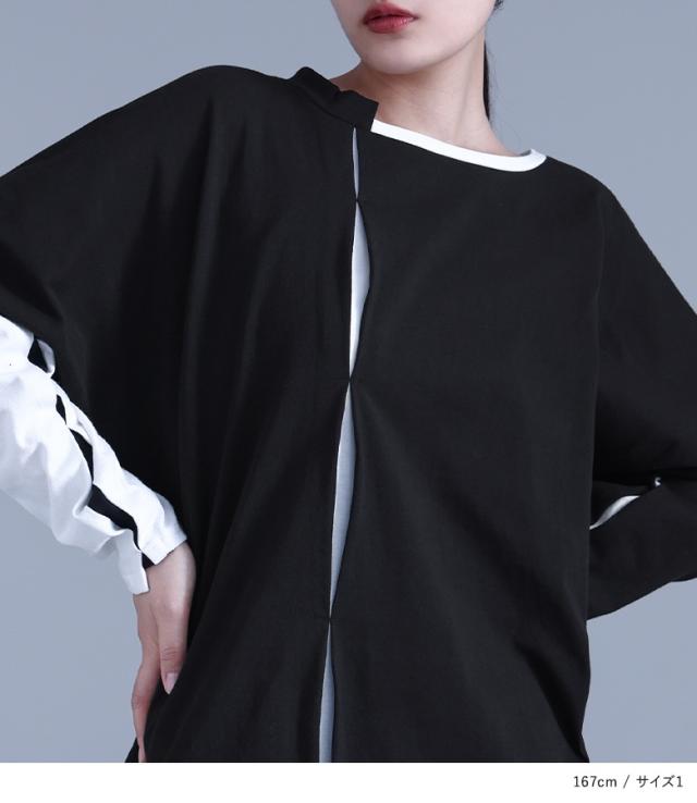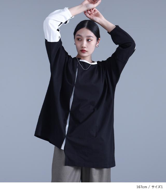 レディース トップス Tシャツ ロンT カットソー クルーネック Uネック ドルマンスリーブ 袖コンシャス 長袖 ロング丈 タック バックタック ドロップショルダー プルオーバー アシンメトリー アシメ 配色 綿100% コットン100% ビッグシルエット ユニセックス おうちで洗える チラ見せ 秋冬春 カジュアル お出掛け 大人女子 大人可愛い モード シンプル ラフ かっこいい Mサイズ Lサイズ LLサイズ 3Lサイズ kOhAKU コハク ブラック 黒 バイカラー ぽっちゃり 体型カバー 大きいサイズ 【トップス】[ID]tck0108[kOhAKUアシンメトリー配色タックカットソー]
