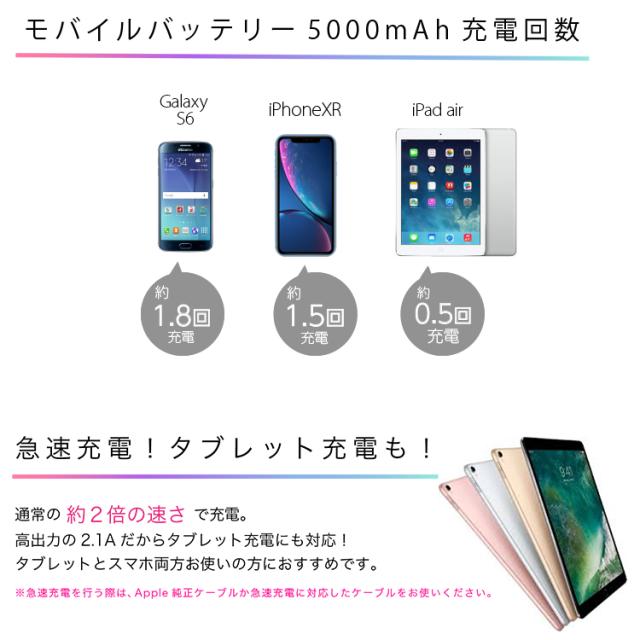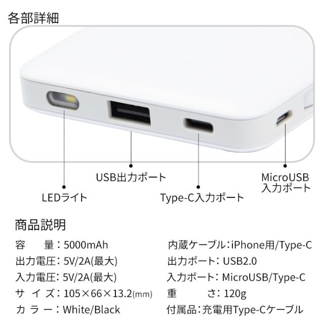 2種類ケーブル内蔵 モバイルバッテリー 5000mAh コンパクト 軽量 2A 急速充電 長期保証 PSE認証 PL保険加入 LED ライト搭載 Type-C iPhone iPad スマホ Galaxy Xperia Android|充電器 持ち運び バッテリー モバイル 充電 充電ケーブル 大容量 災害