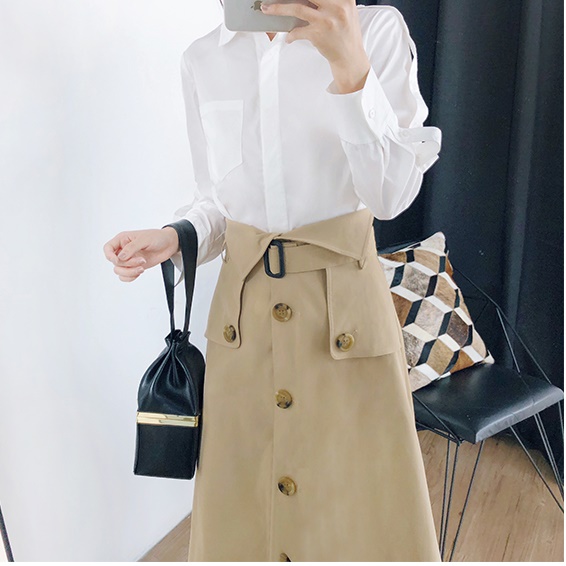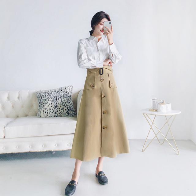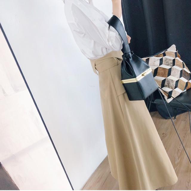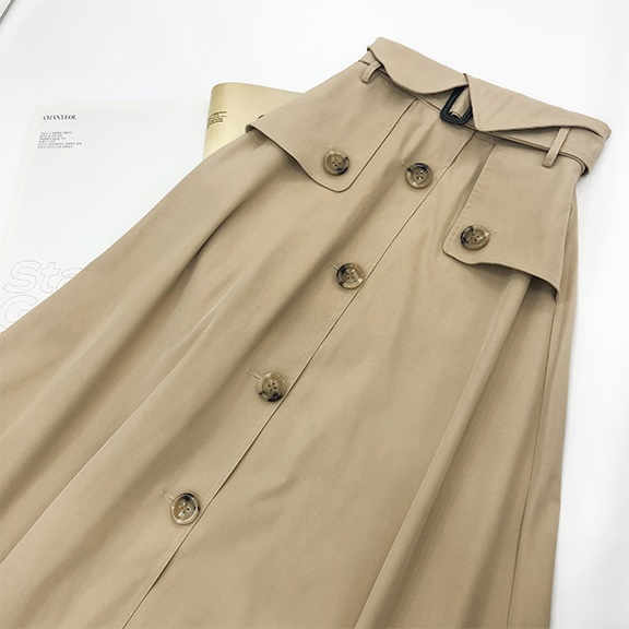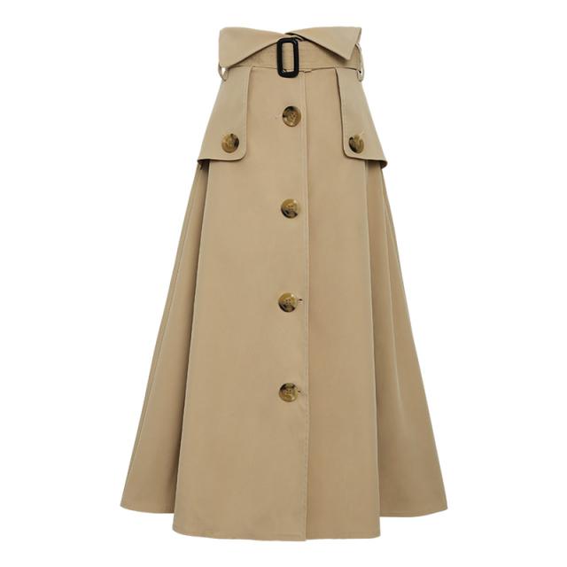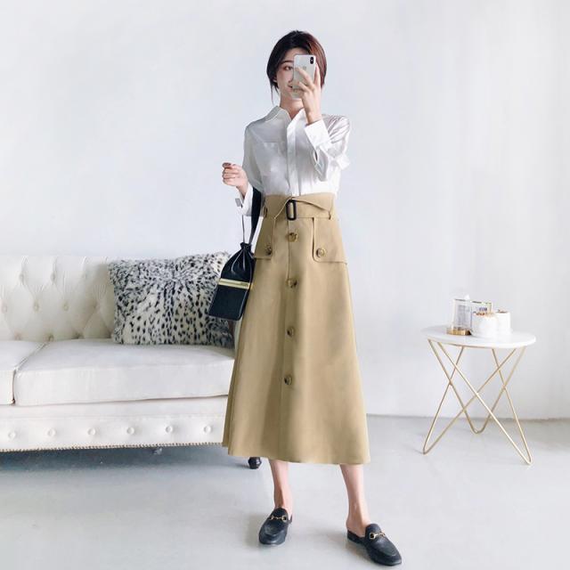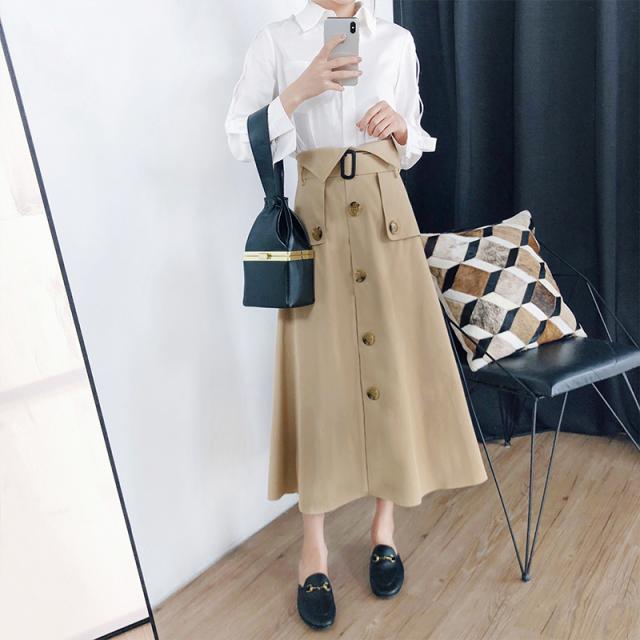 ハイウエストスカート ロング丈 2019年秋 春 Aライン ウエストマーク 大きいサイズ レディース ボトムス トレンチ チノ きれいめ おしゃれ ウエストベルト ボタンデザイン 大人可愛い トレンド 人気 体型カバー お出かけ 通勤 カジュアル フェミニン