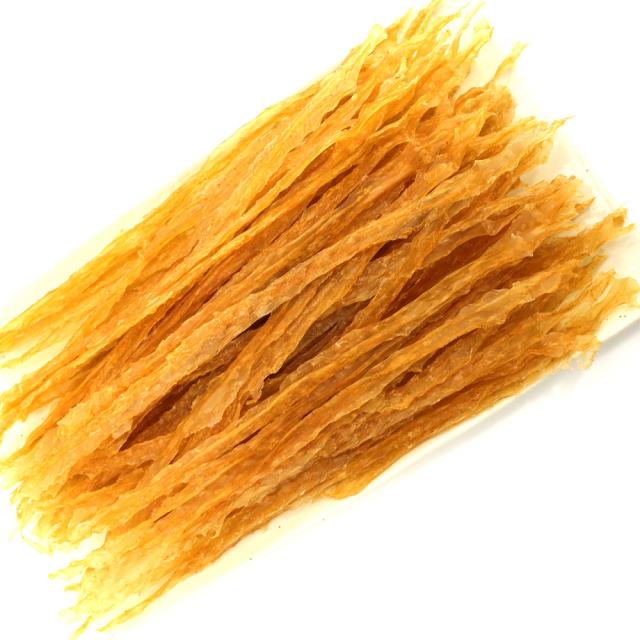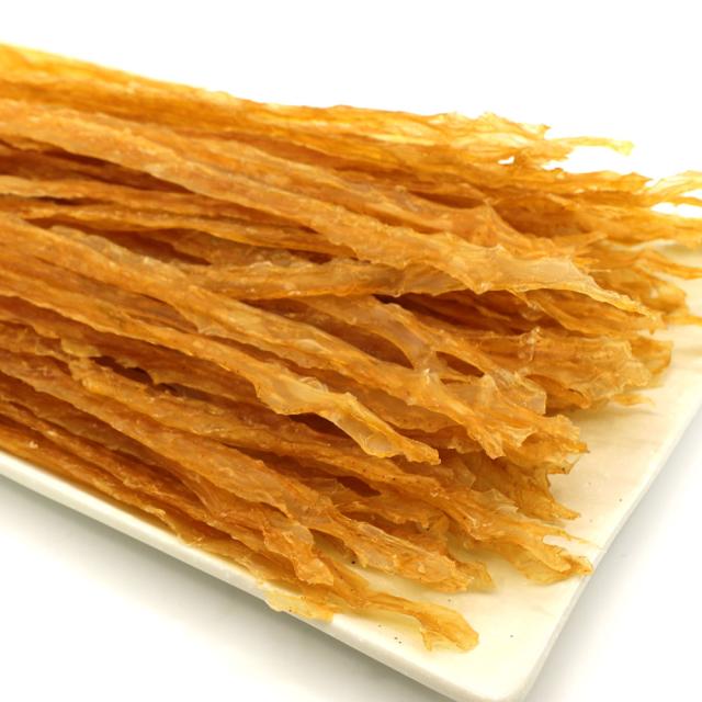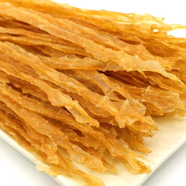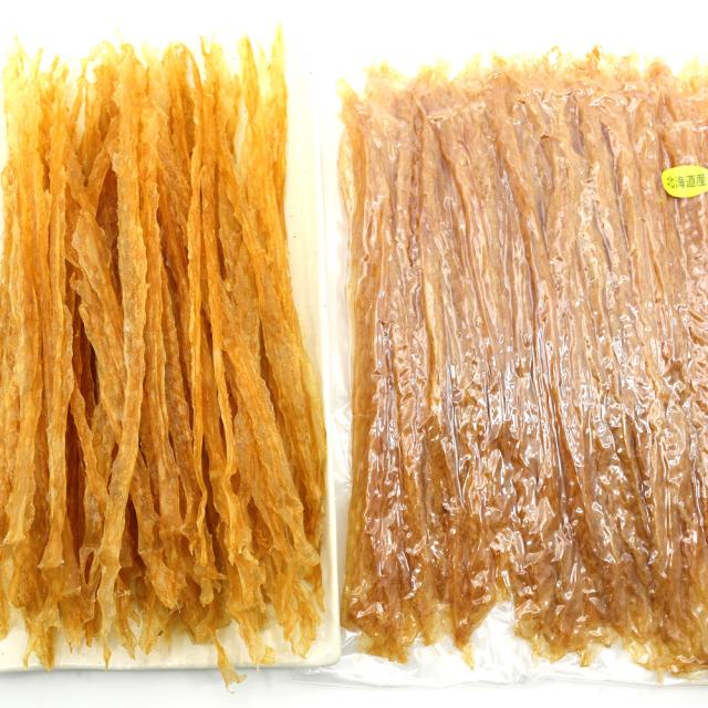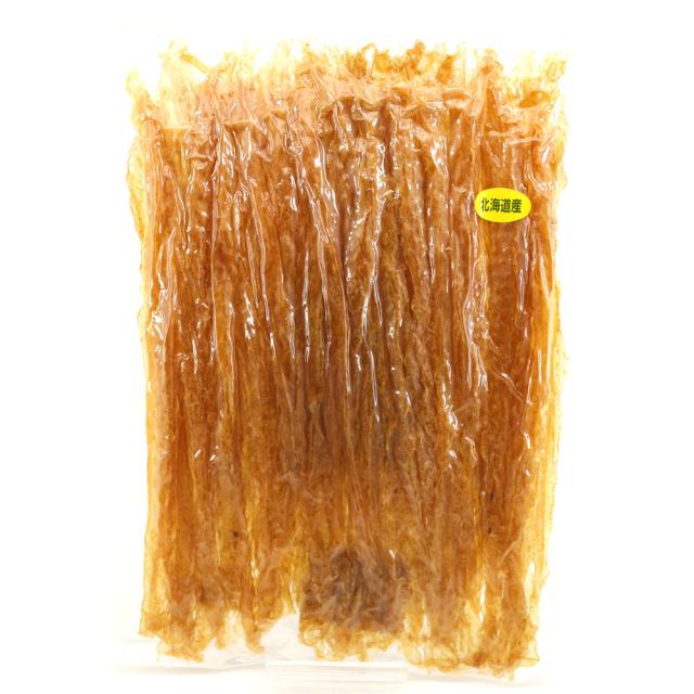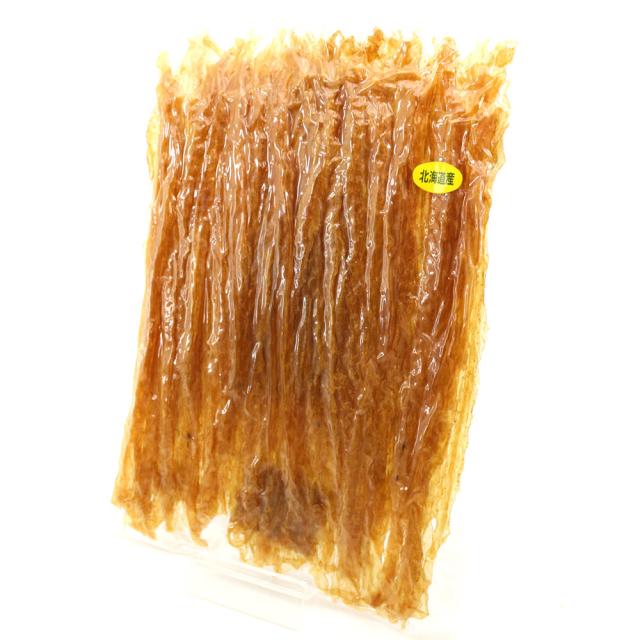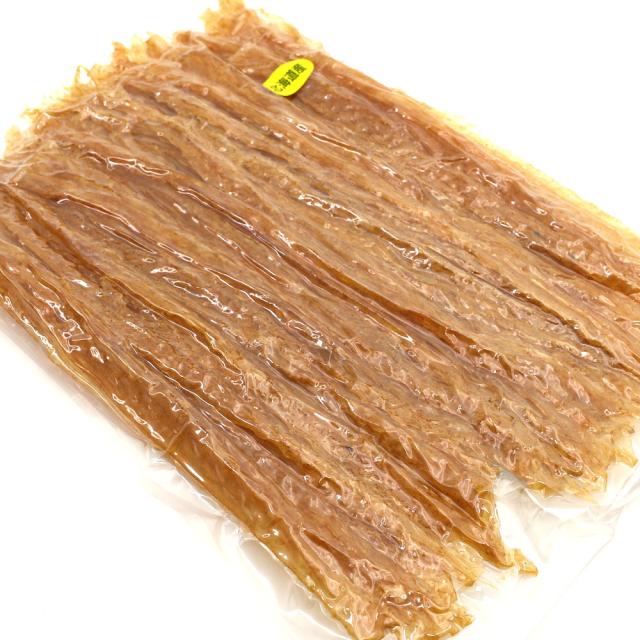 北海道産ほたて(帆立)の貝ひもをほんのりと甘辛風味に味付けし、きれいにローラーで伸して丁寧に仕上げたおつまみ珍味です。