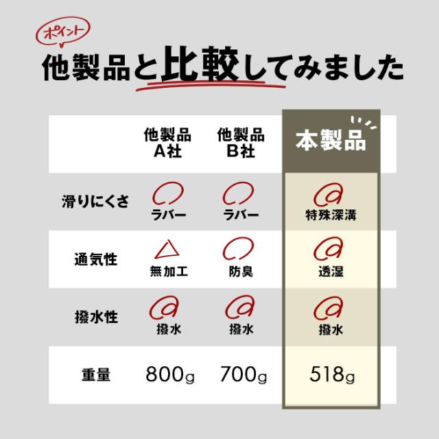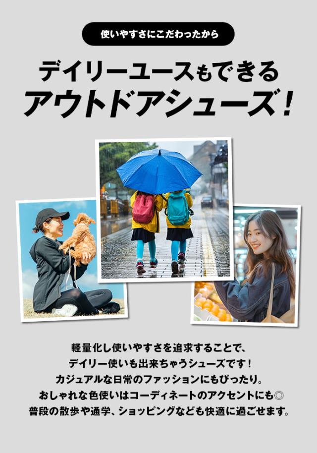 | 注意点 | ※本製品は完全防水靴ではありません。防水・透湿素材を使用していますが構造上、縫目から水がしみることがあります。特に防水性を必要とするときは防水液等を塗布してください。 ※シューズに表示されているサイズは、あくまでも目安です。 ※かかとを踏んでのご使用は絶対にお避けください。靴を傷めるだけでなく怪我の原因になる場合があります。 ※乾燥させる場合は、風通しの良い場所で陰干しにしてください。 ※油のひいてある場所での使用は避けてください。 ※かゆみ・かぶれ等を感じたら直ちに使用をやめてください。 ※路面の状況によっては滑ることがありますので十分ご注意ください。 ※カメラやモニターの性質により、画像と実物の色の違いがある場合がございますのでご理解願います。 |