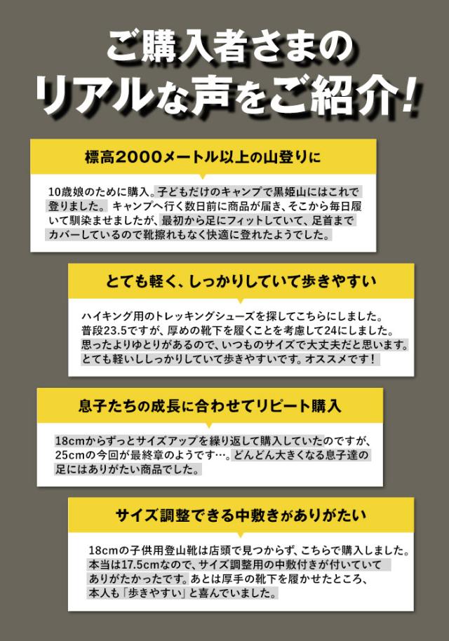 - 成長の早い子供に買う登山靴はどのような物が良いか悩みと思いますが、値段と性能を考えるとこの靴が良いのではないでしょうか。お陰で娘との登山を楽しめてます!
