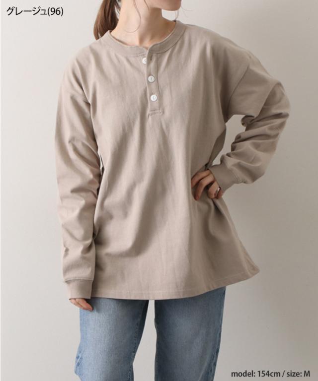胸元のボタンがシンプルなアイテムにアクセントを与えたロングスリーブTシャツ