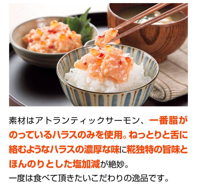 原材料:アトランティックサーモン、米こうじ、いくら、清酒、食塩、発酵調味料、唐辛子、調味料(アミノ酸等)、酒精、酸味料、pH調整剤、唐辛子抽出物、安定剤(キサンタン)、酸化防止剤(ビタミンC)、(原材料の一部に大豆、豚肉を含む)