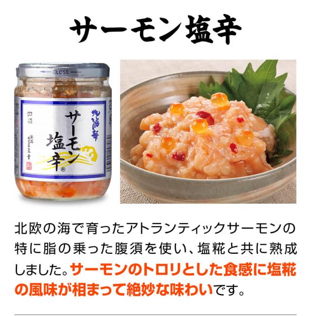 メディアでも多く取り上げられている人気の「サーモン塩辛」の食べ比べセットです。