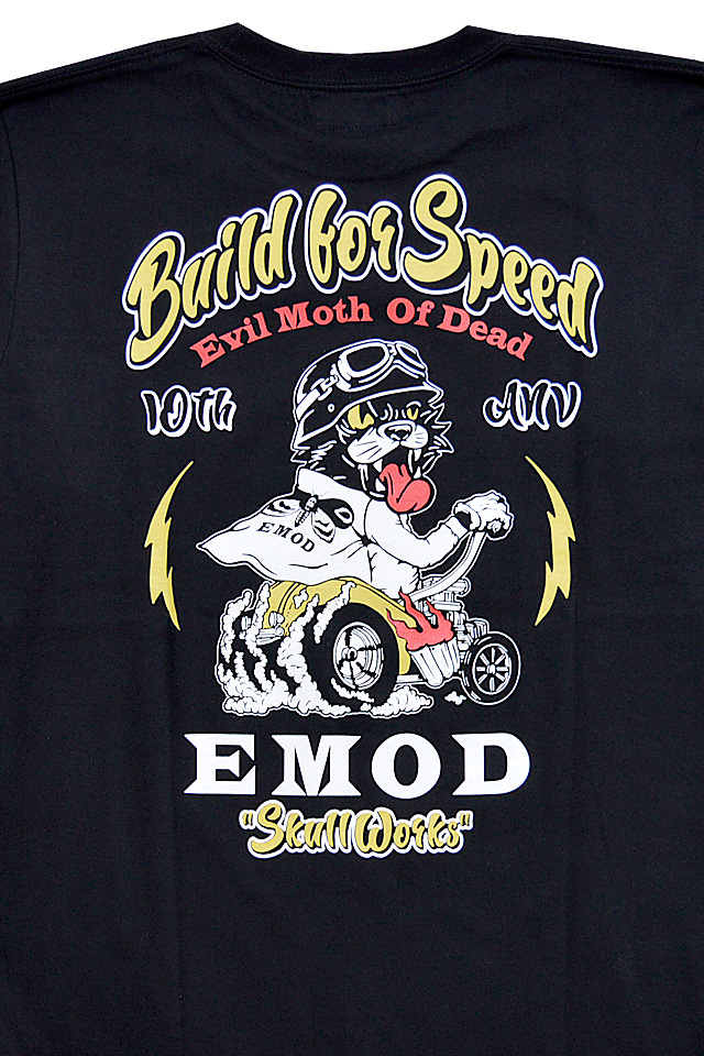背中には、「EMOD」のジャケットを着こなしたキャットボーイが愛車に跨る姿が描かれています。