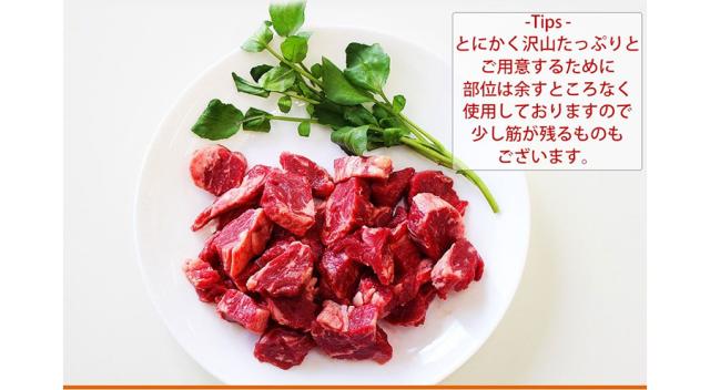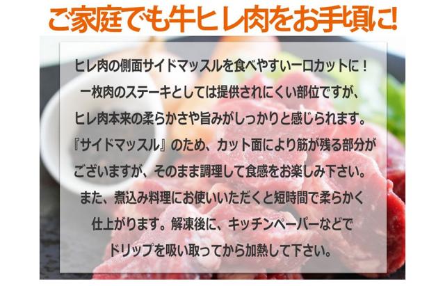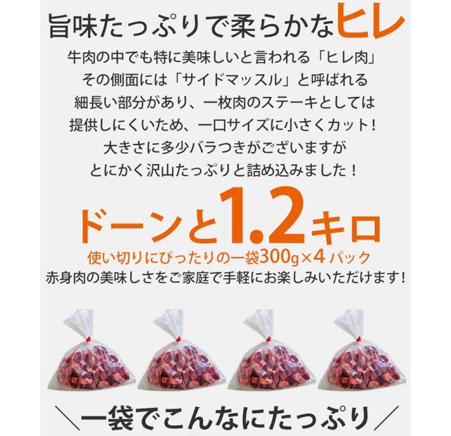 大自然で育った牛からとれるヒレ肉を使用。ヒレの側面に付いている「サイドマッスル」と呼ばれる肉をひと口大に切り、1.2kgのお得サイズでお届け。そもそもヒレ肉ゆえ、味も食感も上質。焼肉、煮込み、揚げ物にとアレンジは自在だ。