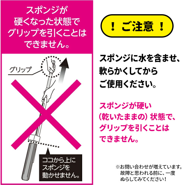 ご使用前にはスポンジに水を含ませ、軟らかくしてからご使用ください。スポンジが硬い(乾いたままの)状態で、グリップを引くことはできません。