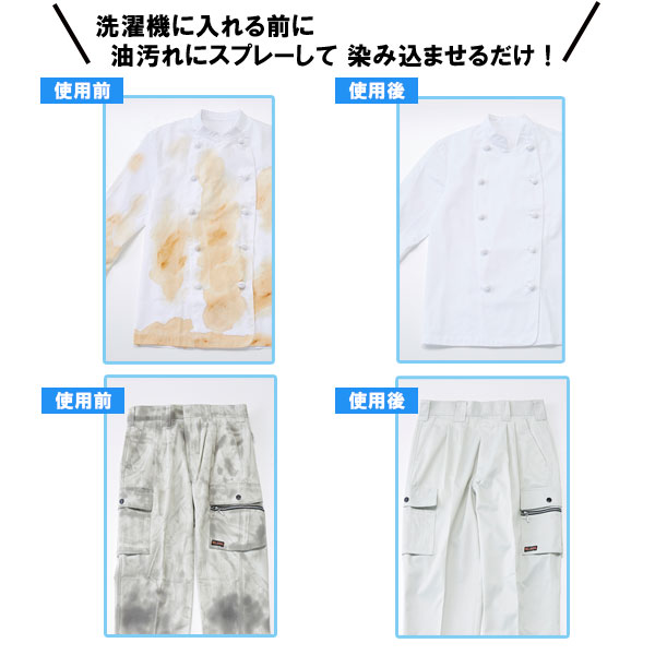 部分洗い 洗剤 業務用 作業服 洗濯洗剤 日本製 国産 プロ用 強力 油じみ 油染み 汚れ 分解 クリーニング ユニフォーム 制服 調理服 ツナギ エプロン オイル染み 飲食店 厨房服 コックコート 油跳ね ガソリンスタンド カーメンテナンス 車両 点検 予備洗い 予洗い 専用 スプレータイプ プロ用 自宅で 家庭用 おすすめ 汚れ落ち 黒ずみ 黒染み 解決 清潔 白く 洗剤 洗浄剤 洗濯前 漬け置き 家事ラク 家事楽 簡単 4989409087477