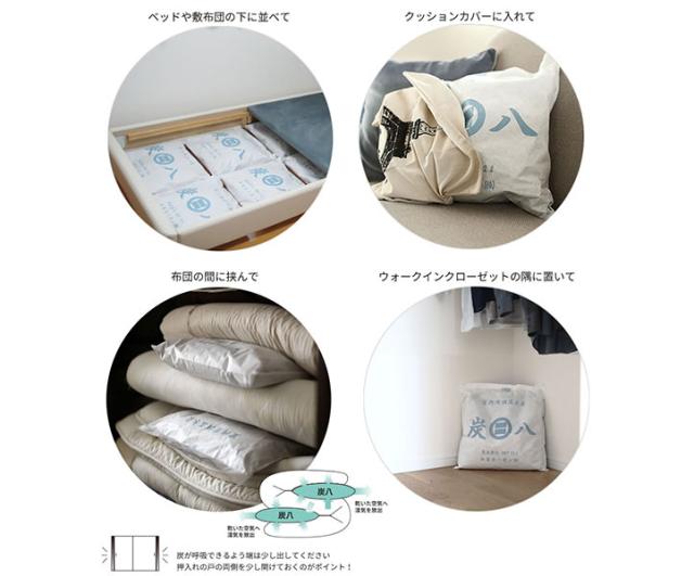 布団の間に挟むと、湿気がとれてふっくらします。炭八を布団から少し出して呼吸できるようにしてください。