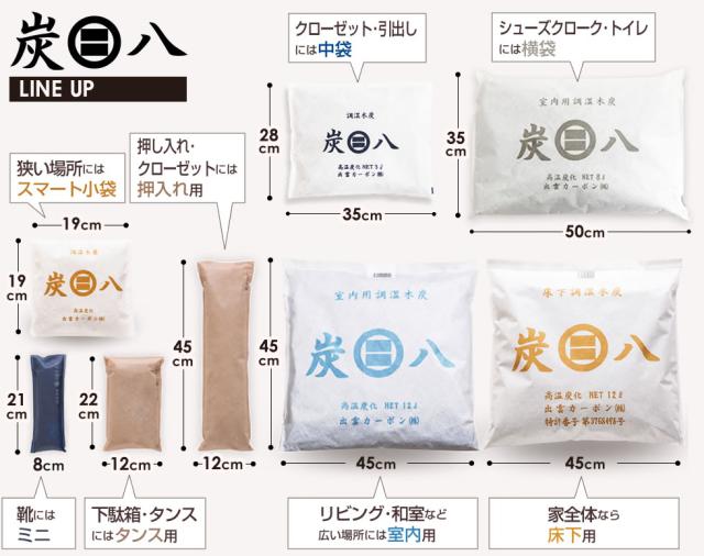 炭八 室内用室内に置いたり、押入れやベッドの下に使用します。チップ状の炭を二重不織布で包んでいます。
