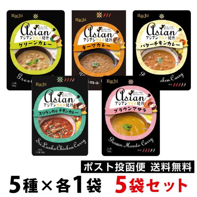 Hachi アジアングルメ紀行/カレー食べ比べ5食セット 5種各1袋 送料無料 ポスト投函便