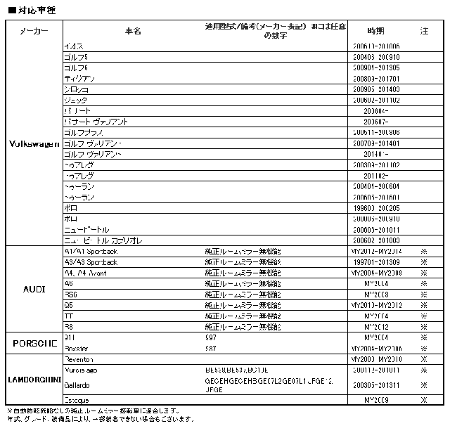 - フォルクスワーゲン:イオス/ゴルフ5/ゴルフ6/ティグアン/シロッコ/ジェッタ/パサート/パサートヴァリアント/ゴルフプラス/ゴルフヴァリアント/トゥアレグ/トゥーラン/ポロ/ニュービートル/ニュービートルカブリオレ