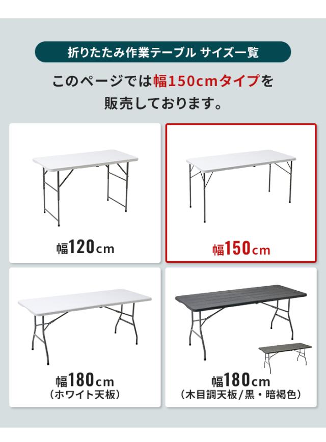 | 【天板が強化プラスチックの折りたたみ作業テーブル】 ● 120cm ● 150cm ● 180cm ● 180cm(木目調) ※このページは[天板が強化プラスチックの折りたたみ作業テーブル 150cm]を販売しております。 |