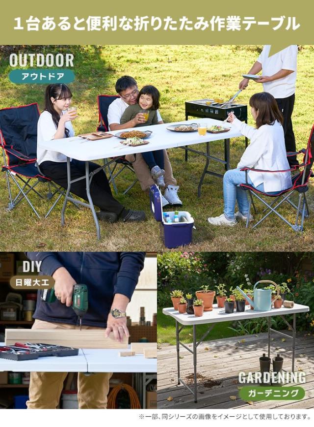 DIYや園芸作業はもちろん、キャンプやバーベキューなどのアウトドアシーン、室内での作業台としても活躍する折りたたみ式作業テーブル。