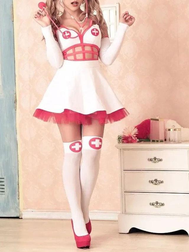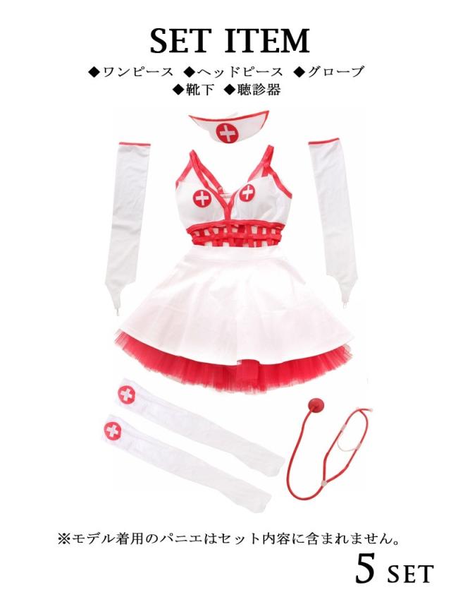☆ワンピース・ヘッドピース・グローブ・靴下・聴診器がセットになった大人セクシーナースコスプレ衣装5点セット♪