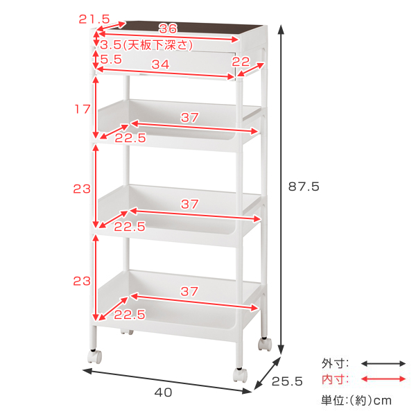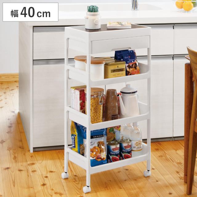 キッチンワゴン 4段 木天板 サージュワゴン 幅40cm 奥行26cm 高さ88cm ( サイドワゴン キッチンラック キッチン収納 四段 キャスター付き ストッカー サイドテーブル 引き出し キッチン収納 キッチン すきま収納)