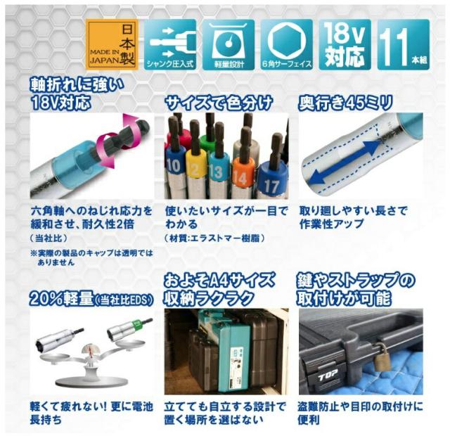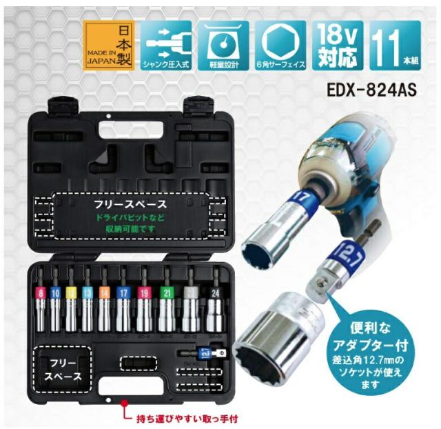 トップ工業 電動ドリル用 アルファソケットセット 11本組 EDX-824AS ケース付 αソケットセット シャンク圧入式 重量1700g 6角サーフェイス TOP工業 224330 ♪