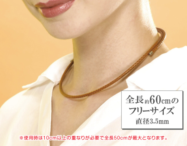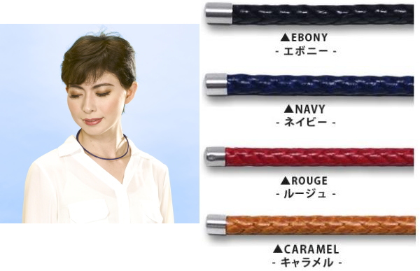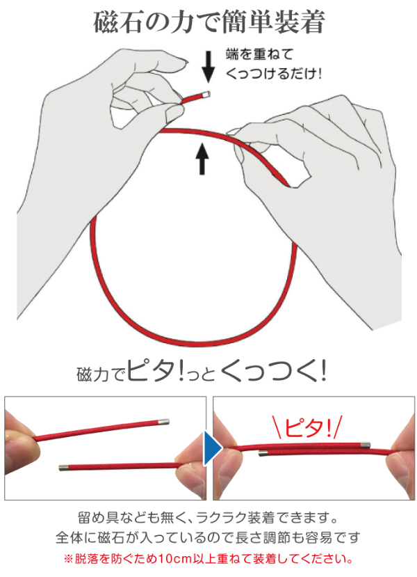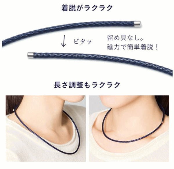 メッシュ状に編み上げたおしゃれなネックレスのコード部全体に、計約150個のネオジム磁石を内蔵。ネックレス同士がネオジム磁石の磁力によりくっつき合う仕組みになっており、留め具を使用せず簡単に着脱できます。ネックレス全体にネオジム磁石が内蔵されているので、首周りに合わせて自由に長さ調節が可能です(ネオジム磁石の磁力で留める仕様のため、キャップ先端より10cm以上二重に重ねてお着けいただくことをおすすめします)。コード素材特有の伸縮性を活かし、適度なハリを保ちながら、首になじむよう、ゆるやかな輪形に仕上げました。さらに、内蔵されているネオジム磁石も首周りの曲線に添うように、小さめのものを使用しています。抗菌防臭性能があるのもうれしいポイントです。