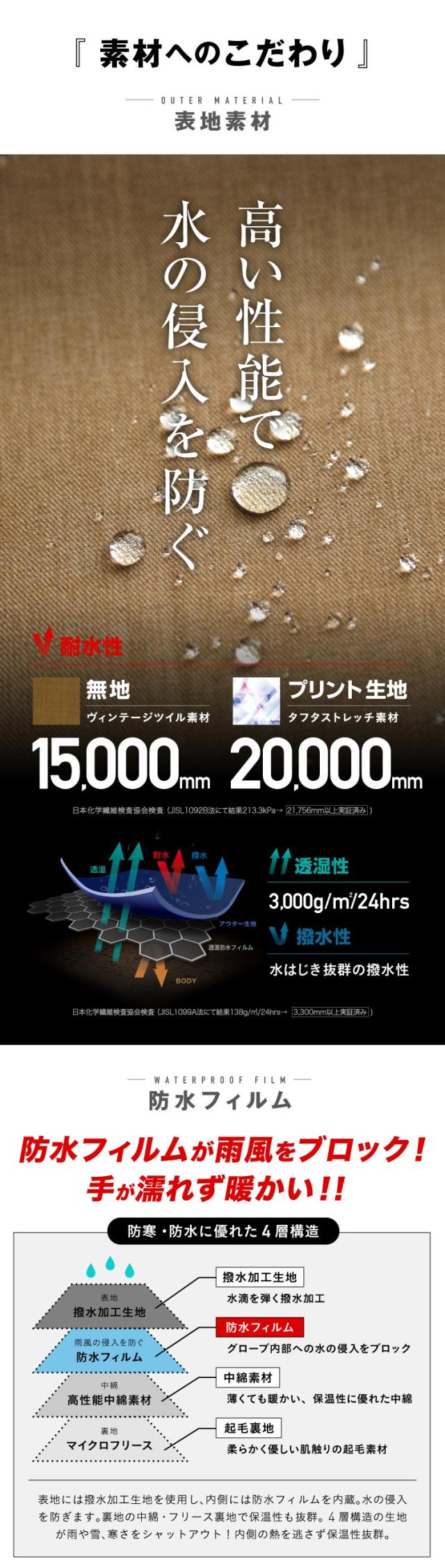 - 外側のグローブのみだと染みてきて内側まで冷たくなってしまう。 インナーグローブを付けてればそんなに問題無さそう。