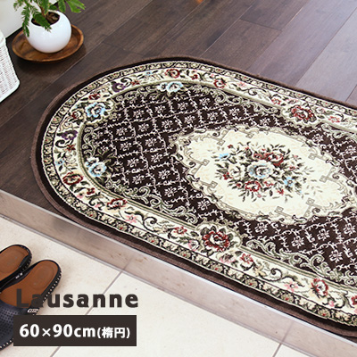 玄関マット マット 室内 屋内 ローザンヌ/60×90cm(楕円形) おしゃれ モケット 花柄 洗える 滑り止め エントランス ドアマット 北欧 玄関 抗菌防臭 ベージュ ブラウン
