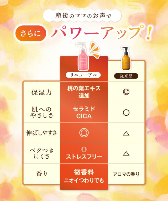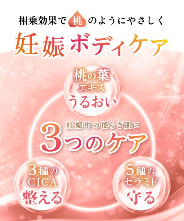 【桃の力で産後もピチッとした肌へ】 桃の葉エキス、3種のCICA成分、5種のセラミドのパワーで産後もピチッとしたお肌に整えます。香りは優しい微香料でニオイつわりでも使いやすいとのお声をいただいております。