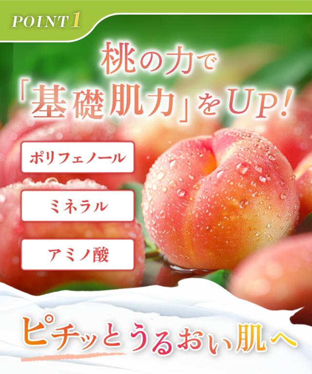 【桃の力で基礎肌力アップ!】 ポリフェノール、ミネラル、アミノ酸を含んだ桃の葉エキスでうるおいを与えます。