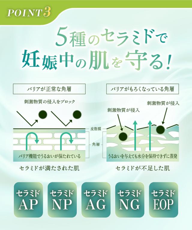【5種のセラミドがお肌を守る】 セラミドが満たされた肌は潤いが保たれると言われています。 ママセレクトのマタニティクリームは5種のセラミド(セラミドAP、セラミドNP、セラミドAG、セラミドNG、セラミドEOP)を贅沢に配合!