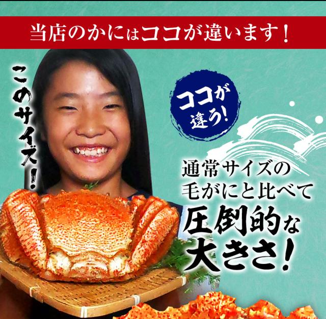 通常サイズの毛ガニと比べても圧倒的な2倍の大きさ。