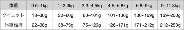 ・この給与量はあくまでも目安です。給与量は犬種、年齢、運動量、性別、季節等様々な要因によって変化しますので、パートナーの様子を見て調節してあげて下さい。