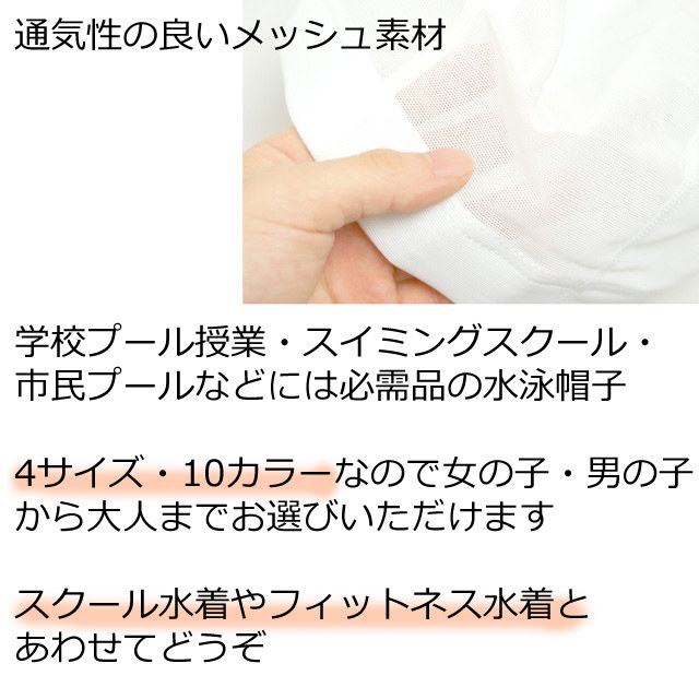 | 商品説明 | 適応:スクール水着 フィットネス水着 プール授業 学校 スイミングスクール サイズ展開:S/M/L/LL 対象:キッズ ジュニア メンズ レディース 男の子 女の子 タイプ:メッシュ 通気性の良いメッシュ素材のスイミングキャップ 学校・スイミングスクール・スポーツセンターなどプールには必需品の水泳帽子 子供から大人サイズまでの展開 カラー豊富なので男の子でも女の子でもお選び頂けます 使用後は水洗いして陰干ししてください |