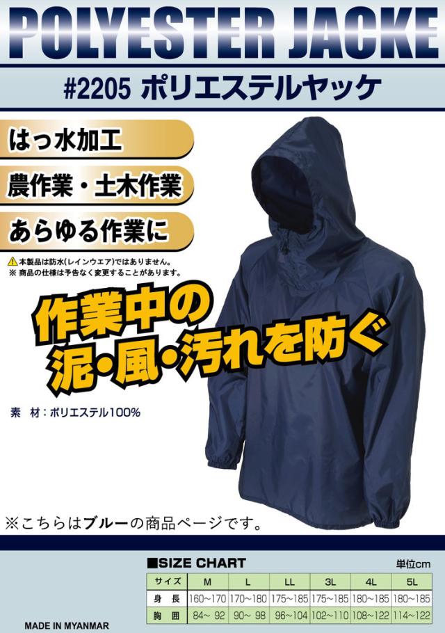 軽作業に快適なワーキングヤッケ。撥水加工で、風・汚れからガード前からかぶるデザインで、前立てからの風の侵入を防ぎます。胸元中央に小物の収納に便利なポケットを配置しました。素材は汚れが付きにくいポリエステル107%に撥水加工を施しました。防水効果はありませんので、カッパとしての使用はできません。
