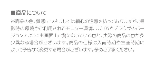 | 注意事項 | ●商品のサイズは全て平置き採寸です。実際の商品とは多少の誤差が生じます ●カラーの選択には間違いがないよう、ご注文前によくお確かめください ●商品の色合いやイメージは商品撮影時の環境や、お客様ご使用のディスプレイ環境により実物と多少の相違が生じることがございます 予め、ご了承お願い申し上げます |